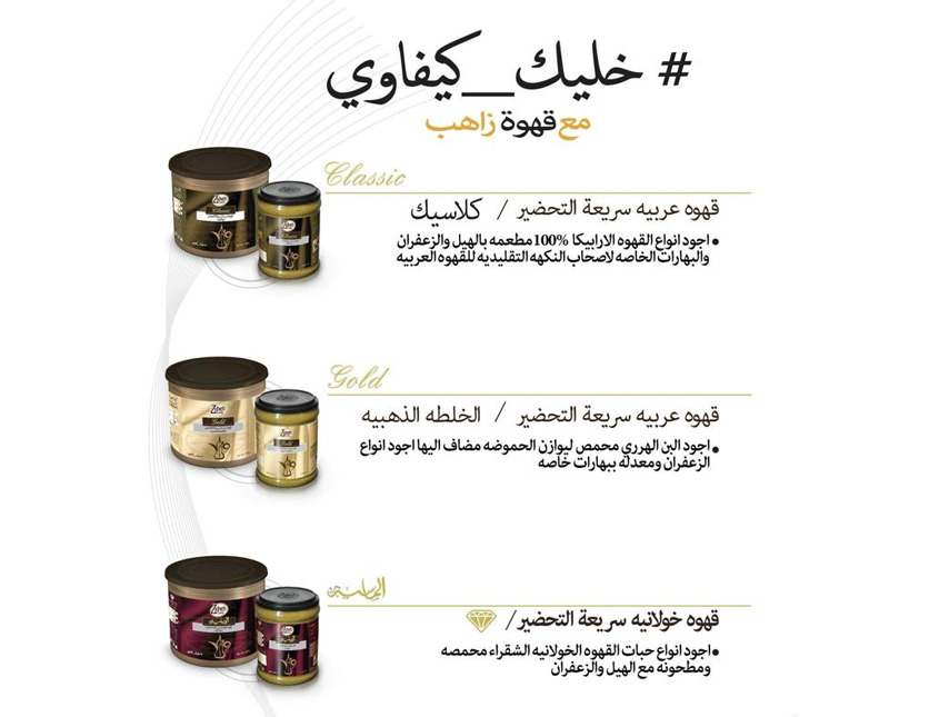 قهوة زاهب بخيارات ثلاث اما الكلاسيك بطعم القهوه والهيل او الذهبيه بطعم التحويجه الخاصه او الماسيه بخلطة عدة انواع من القهوه